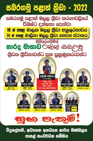 30 Nov2022 සබරගමු පළාත් ක්රීඩා - 2022 නාරද ක්රීඩා ඉතිහාසය නැවතත් වෙනස්කල වසරක් වැඩිම ක්රීඩා ජයග්රහණ ලබාගත් වසරක් දරුවන් 11දෙනෙකු කල වික්රමයක් Read more ...